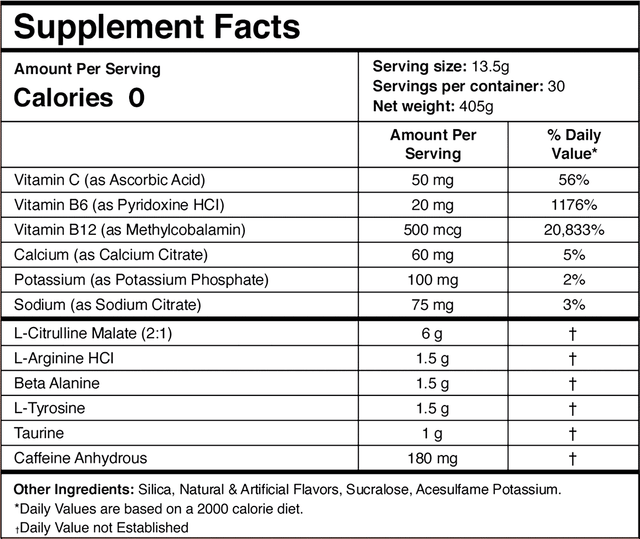 It's got everything you need and nothing you don't, with Beta Alanine to delay fatigue, Taurine to support metabolism & increase athletic performance, Citrulline Malate to increase blood flow, and energy boosting Vitamins, this pre-workout checks all the boxes.*