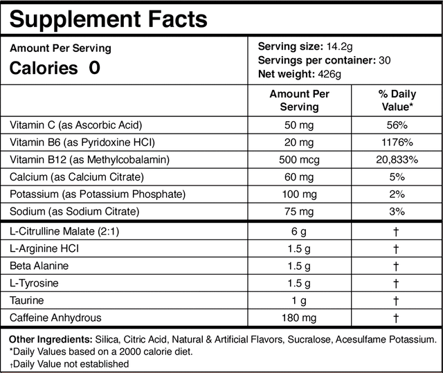 It's got everything you need and nothing you don't, with Beta Alanine to delay fatigue, Taurine to support metabolism & increase athletic performance, Citrulline Malate to increase blood flow, and energy boosting Vitamins, this pre-workout checks all the boxes.*